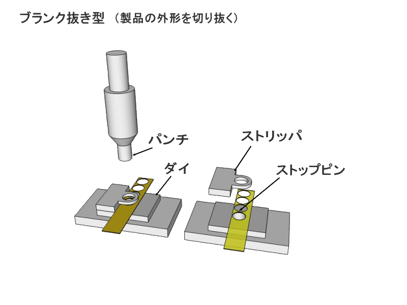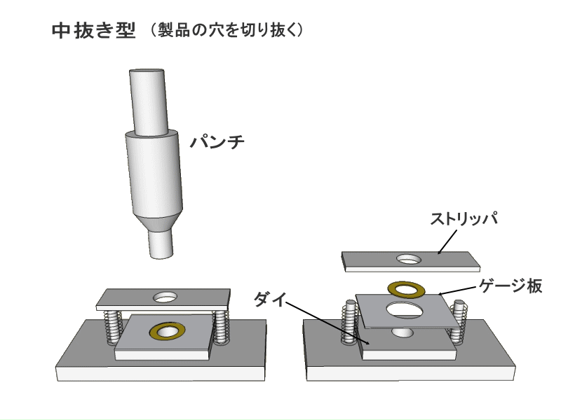 それ以外の部分では 取り付け部として ベース板、シャンク、コミなど。 材料の板や製品などの位置決め用部品として ゲージ板、ガイド板、位置決めピンなど 製品や抜きカスを分離するための ストリッパ、ノックアウトなど パンチとダイの位置関係を維持するための ガイドポストなどがあります